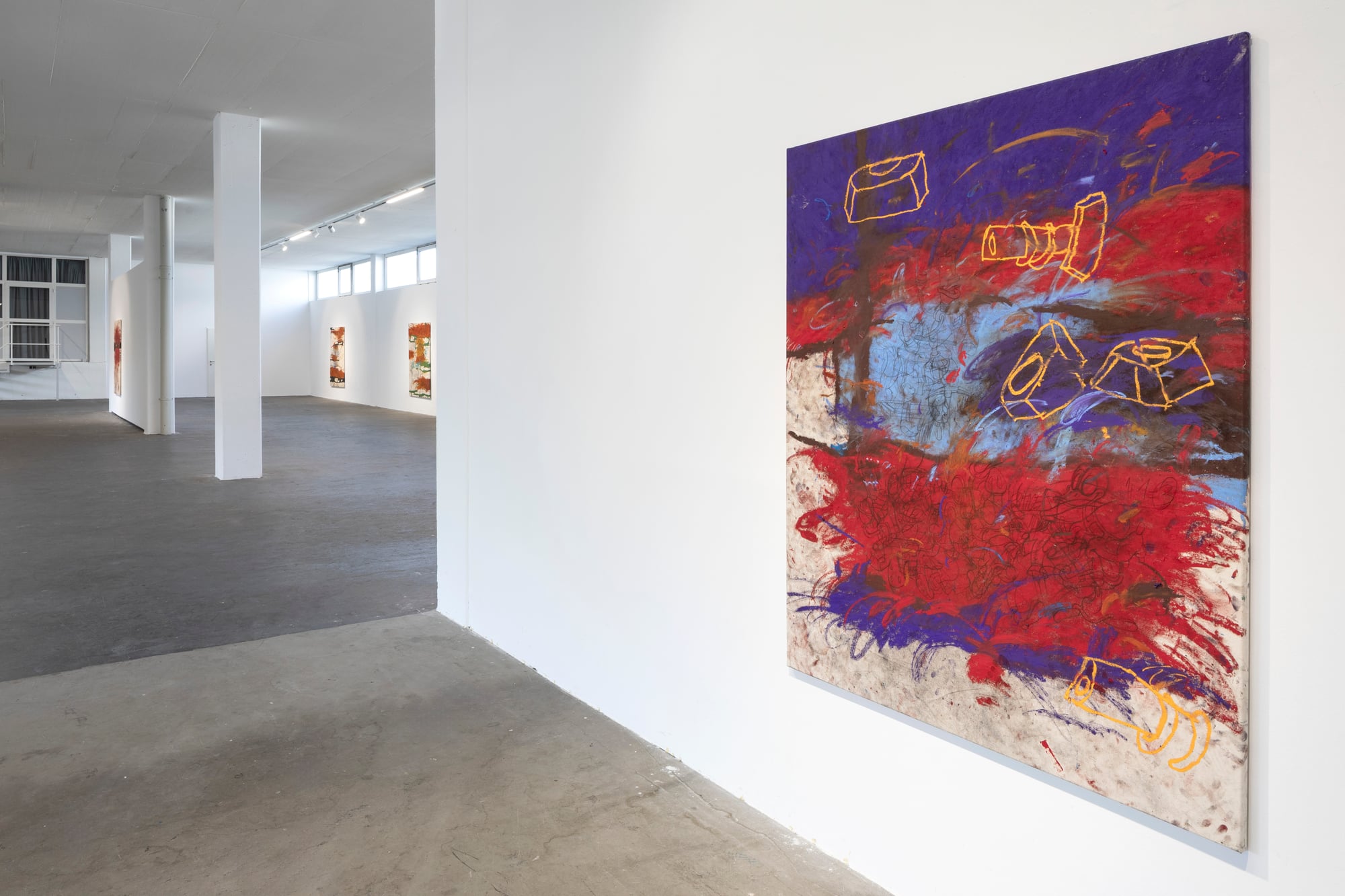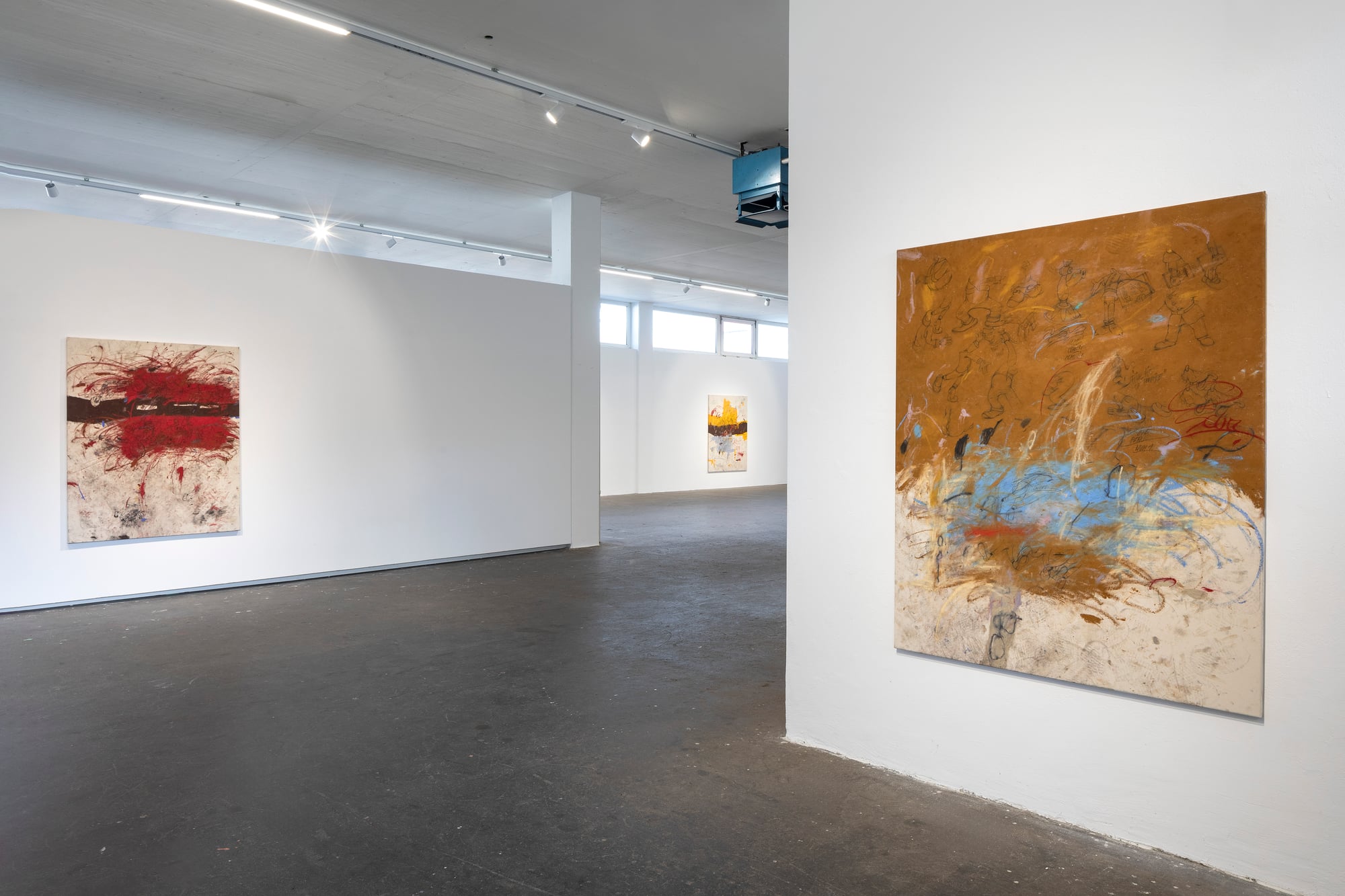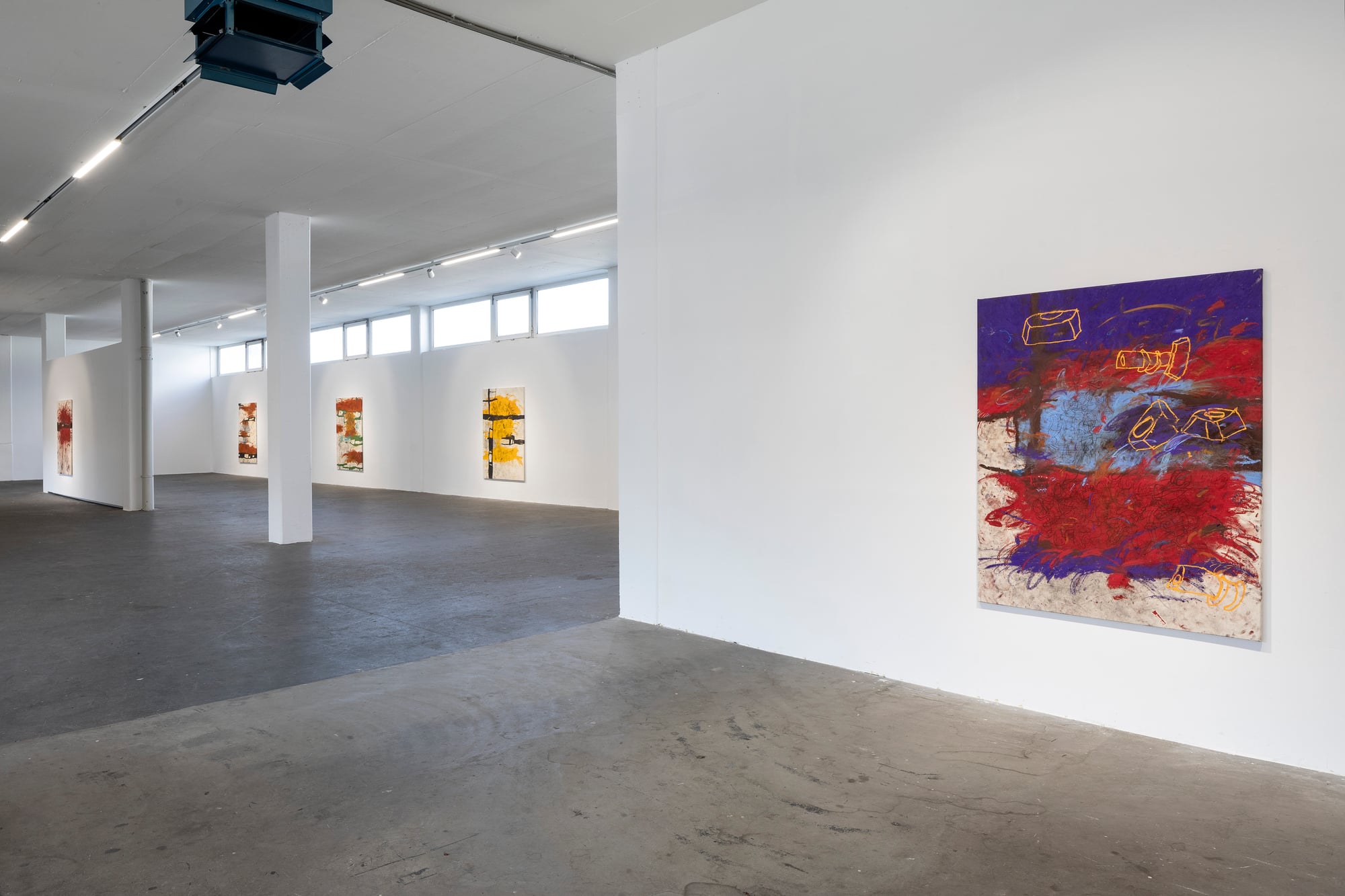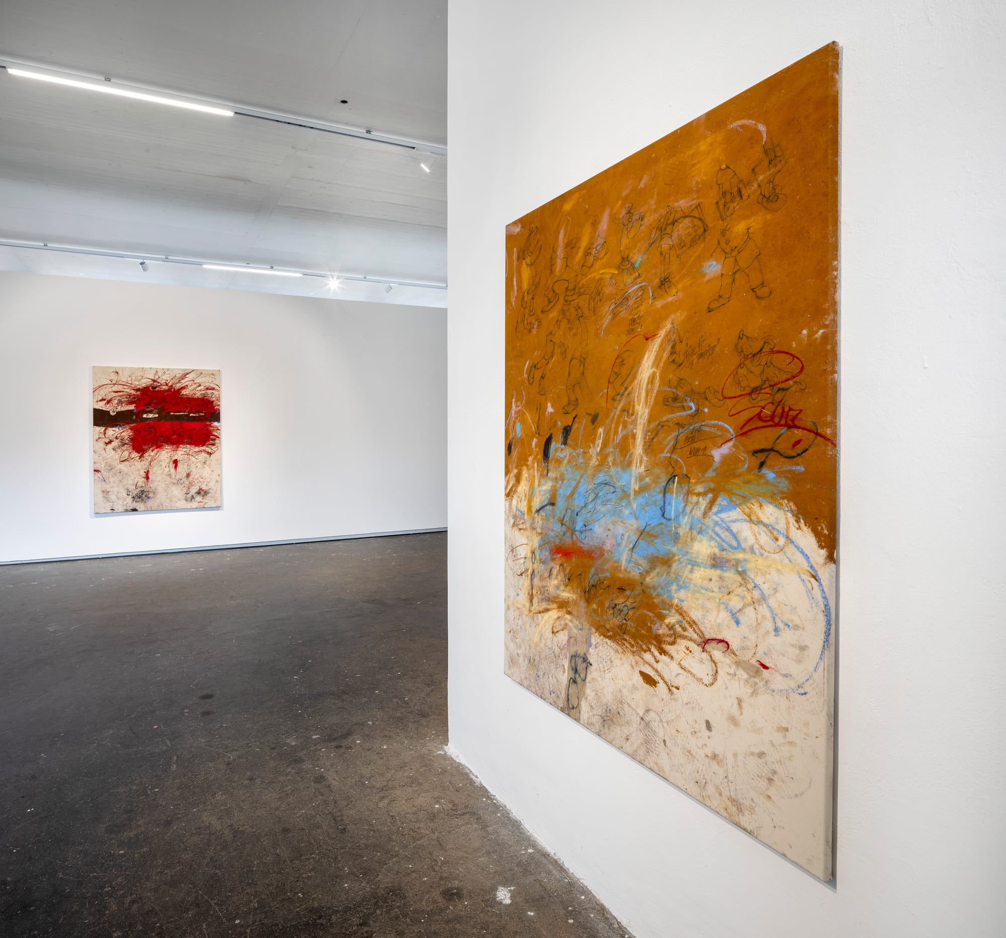 Ester Parasková – FUGAZI Fragmented Disney figures appear as anonymized archetypes: incomplete, deformed, yet instantly recognizable through bodily signatures embedded deep within collective visual memory. Their repeated precision recalls motion studies and early modern attempts to mechanize movement—moments when motion itself carried the promise of revolt. For Parasková, these figures become markers of labor, echoing both the repetitive work of Disney animators and her own experience in factory production. Deformation, fragmentation, and repetition function not as pure analysis, but as a dialectical process in which the breakdown of mechanical systems simultaneously constructs them. Situated between work and gesture, appropriation and authenticity, Parasková’s paintings embrace repetition while resisting its logic. Traces of physical confrontation—dirt, smudges, footprints—remain visible, grounding the images in bodily presence. FUGAZI—fake, feigned, illusory—names this tension directly: the artist mechanically reproduces what is already endlessly reproduced, yet through distortion and layering transforms it into a charged, combative visual language. The result is painting as struggle—urgent, physical, and unresolved