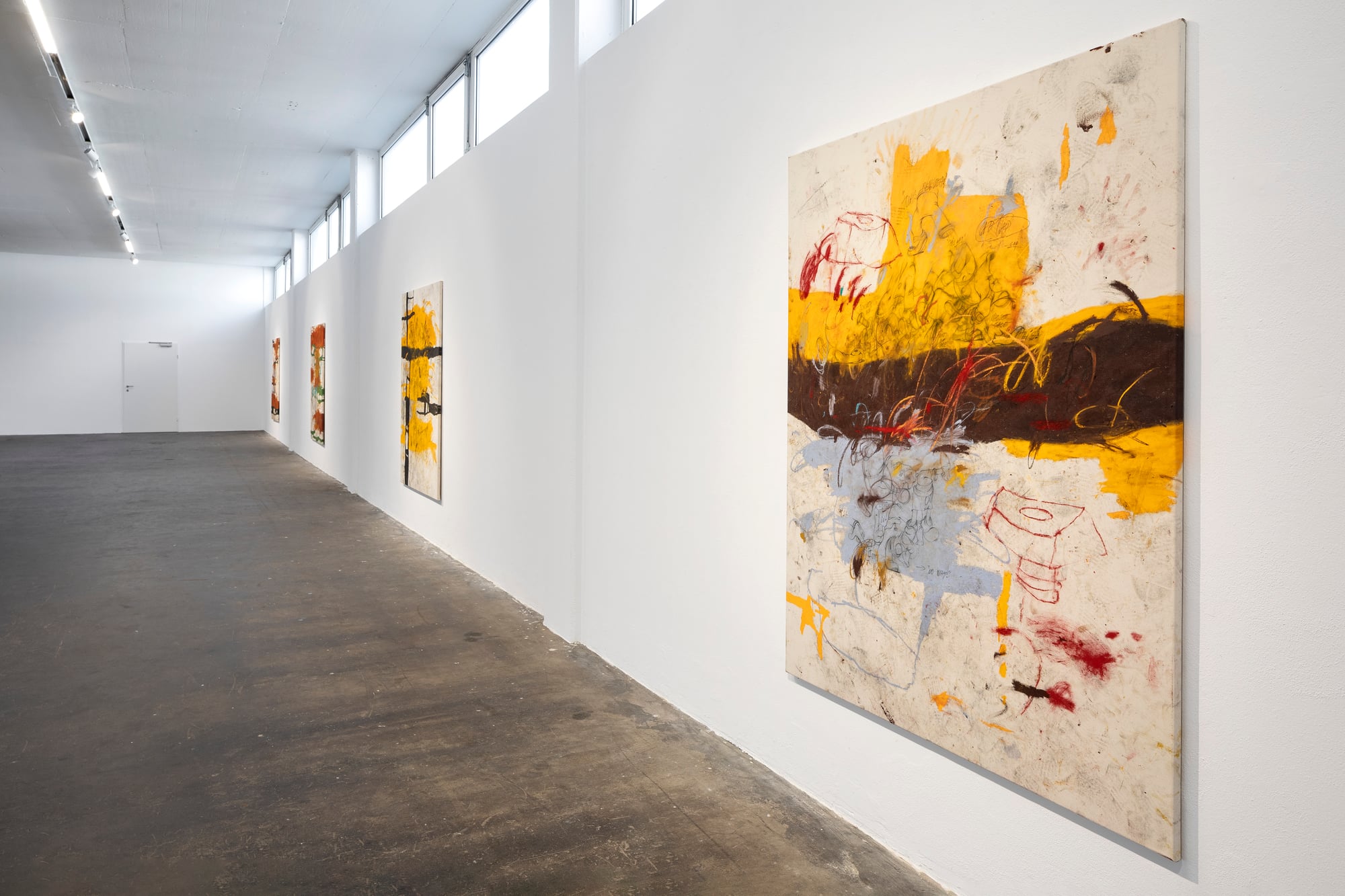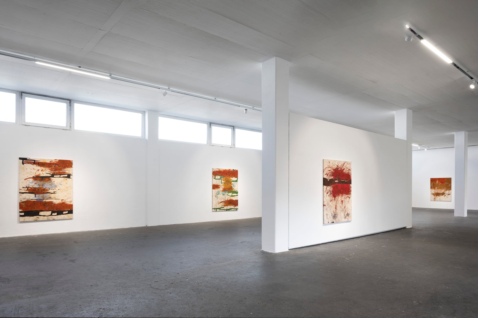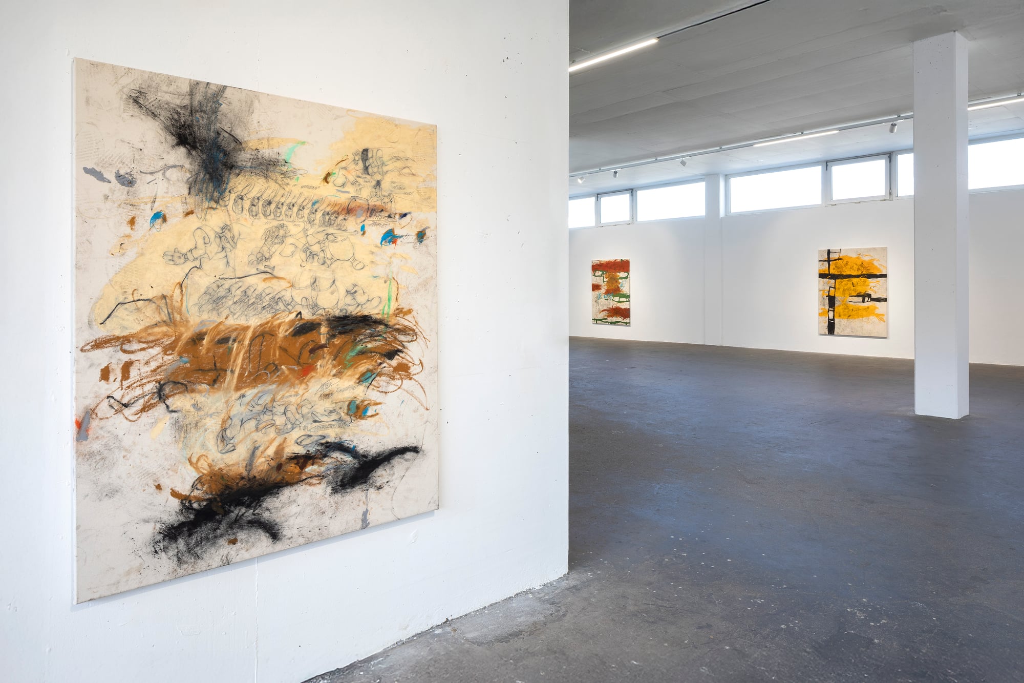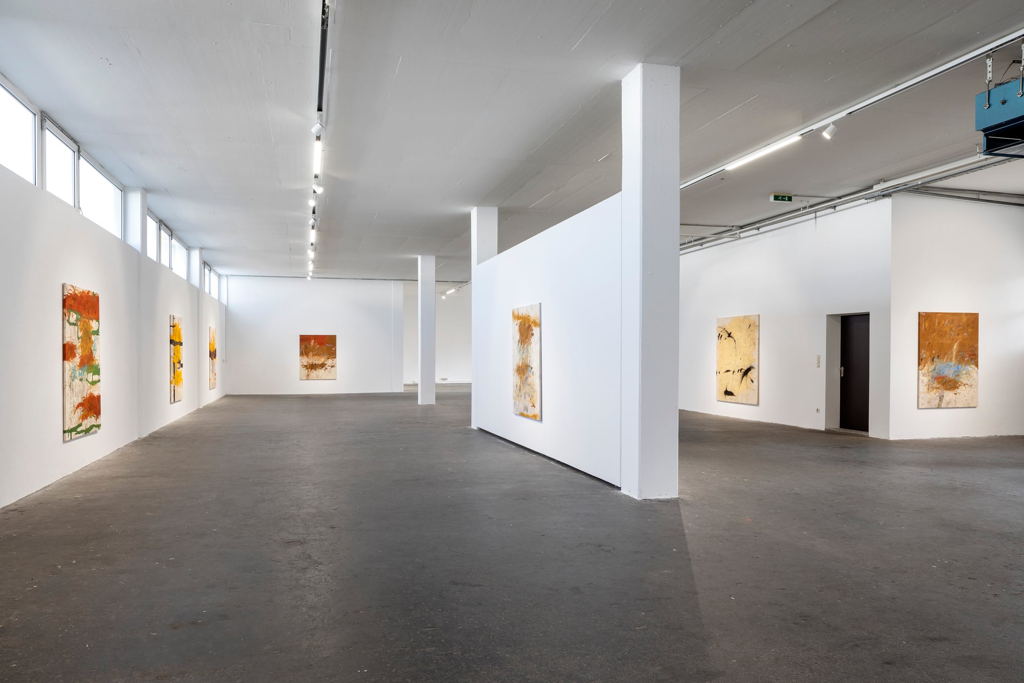 Ester Parasková – FUGAZI Fragmented Disney figures appear as anonymized archetypes: incomplete, deformed, yet instantly recognizable through bodily signatures embedded deep within collective visual memory. Their repeated precision recalls motion studies and early modern attempts to mechanize movement—moments when motion itself carried the promise of revolt. For Parasková, these figures become markers of labor, echoing both the repetitive work of Disney animators and her own experience in factory production. Deformation, fragmentation, and repetition function not as pure analysis, but as a dialectical process in which the breakdown of mechanical systems simultaneously constructs them. Situated between work and gesture, appropriation and authenticity, Parasková’s paintings embrace repetition while resisting its logic. Traces of physical confrontation—dirt, smudges, footprints—remain visible, grounding the images in bodily presence. FUGAZI—fake, feigned, illusory—names this tension directly: the artist mechanically reproduces what is already endlessly reproduced, yet through distortion and layering transforms it into a charged, combative visual language. The result is painting as struggle—urgent, physical, and unresolved
