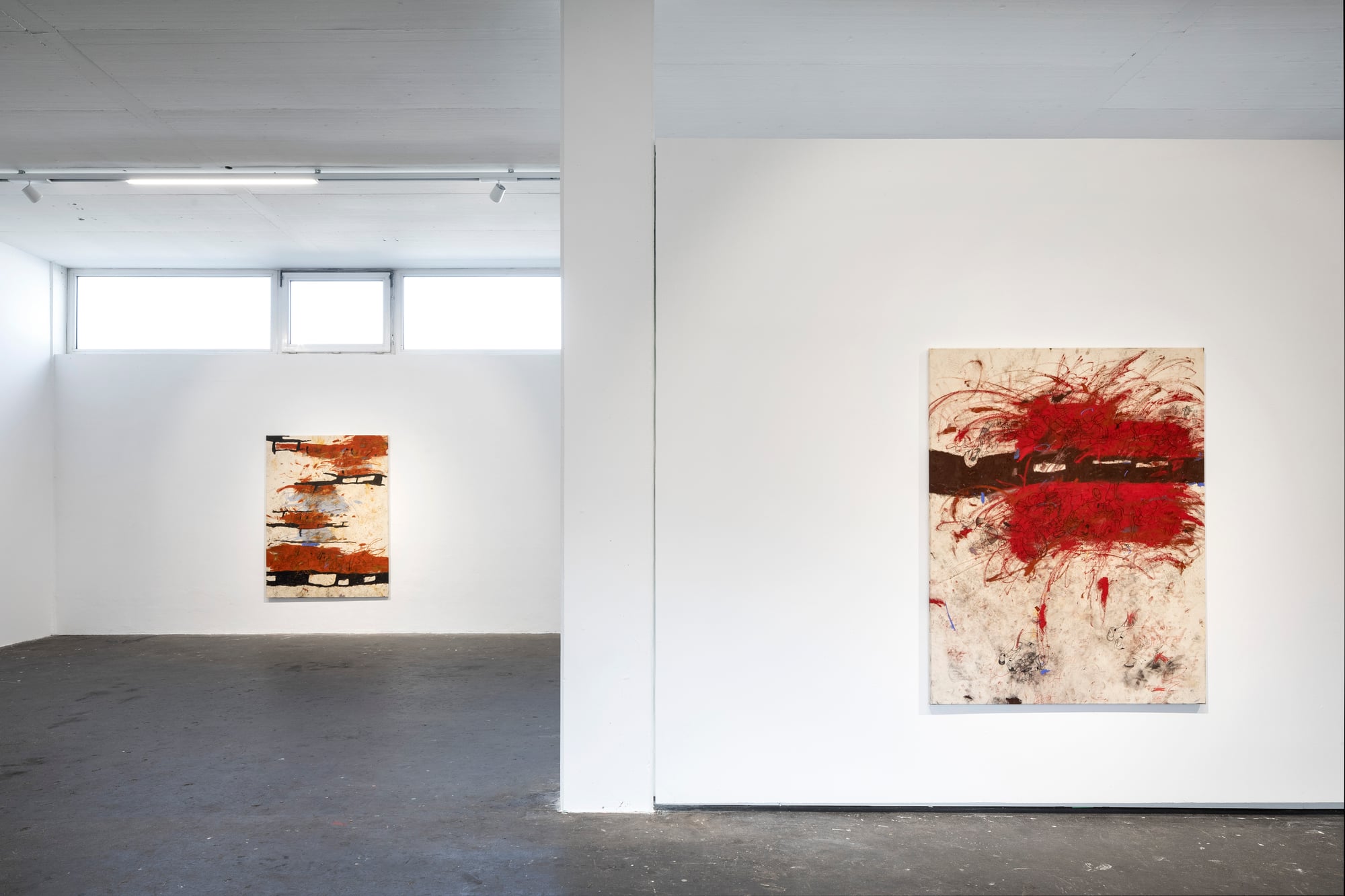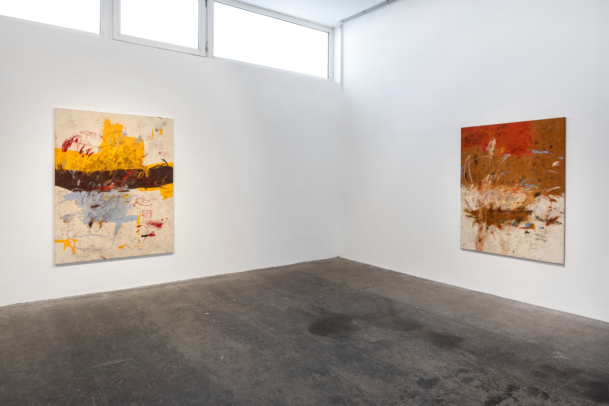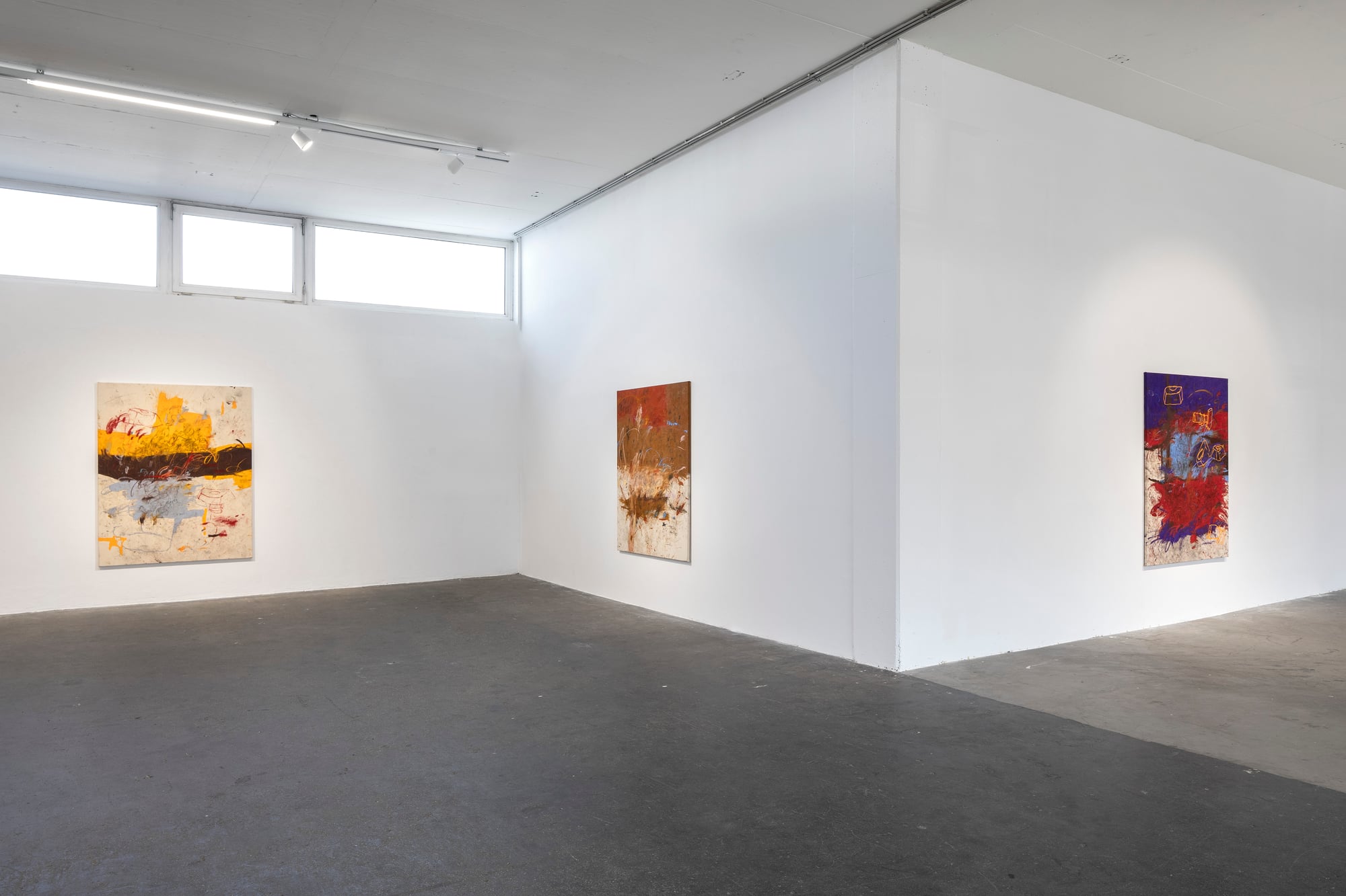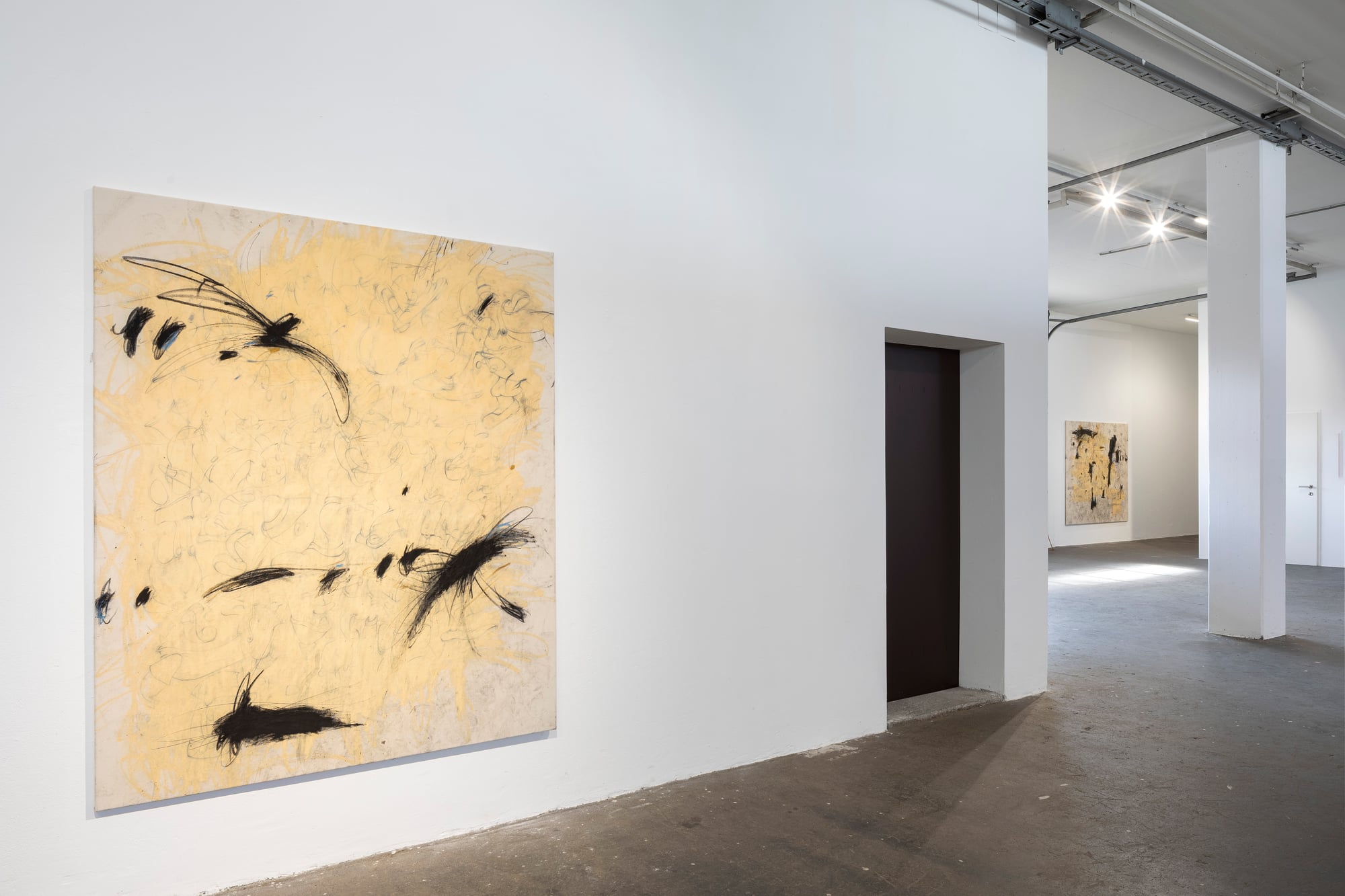 Ester Parasková – FUGAZI Fragmented Disney figures appear as anonymized archetypes: incomplete, deformed, yet instantly recognizable through bodily signatures embedded deep within collective visual memory. Their repeated precision recalls motion studies and early modern attempts to mechanize movement—moments when motion itself carried the promise of revolt. For Parasková, these figures become markers of labor, echoing both the repetitive work of Disney animators and her own experience in factory production. Deformation, fragmentation, and repetition function not as pure analysis, but as a dialectical process in which the breakdown of mechanical systems simultaneously constructs them. Situated between work and gesture, appropriation and authenticity, Parasková’s paintings embrace repetition while resisting its logic. Traces of physical confrontation—dirt, smudges, footprints—remain visible, grounding the images in bodily presence. FUGAZI—fake, feigned, illusory—names this tension directly: the artist mechanically reproduces what is already endlessly reproduced, yet through distortion and layering transforms it into a charged, combative visual language. The result is painting as struggle—urgent, physical, and unresolved
