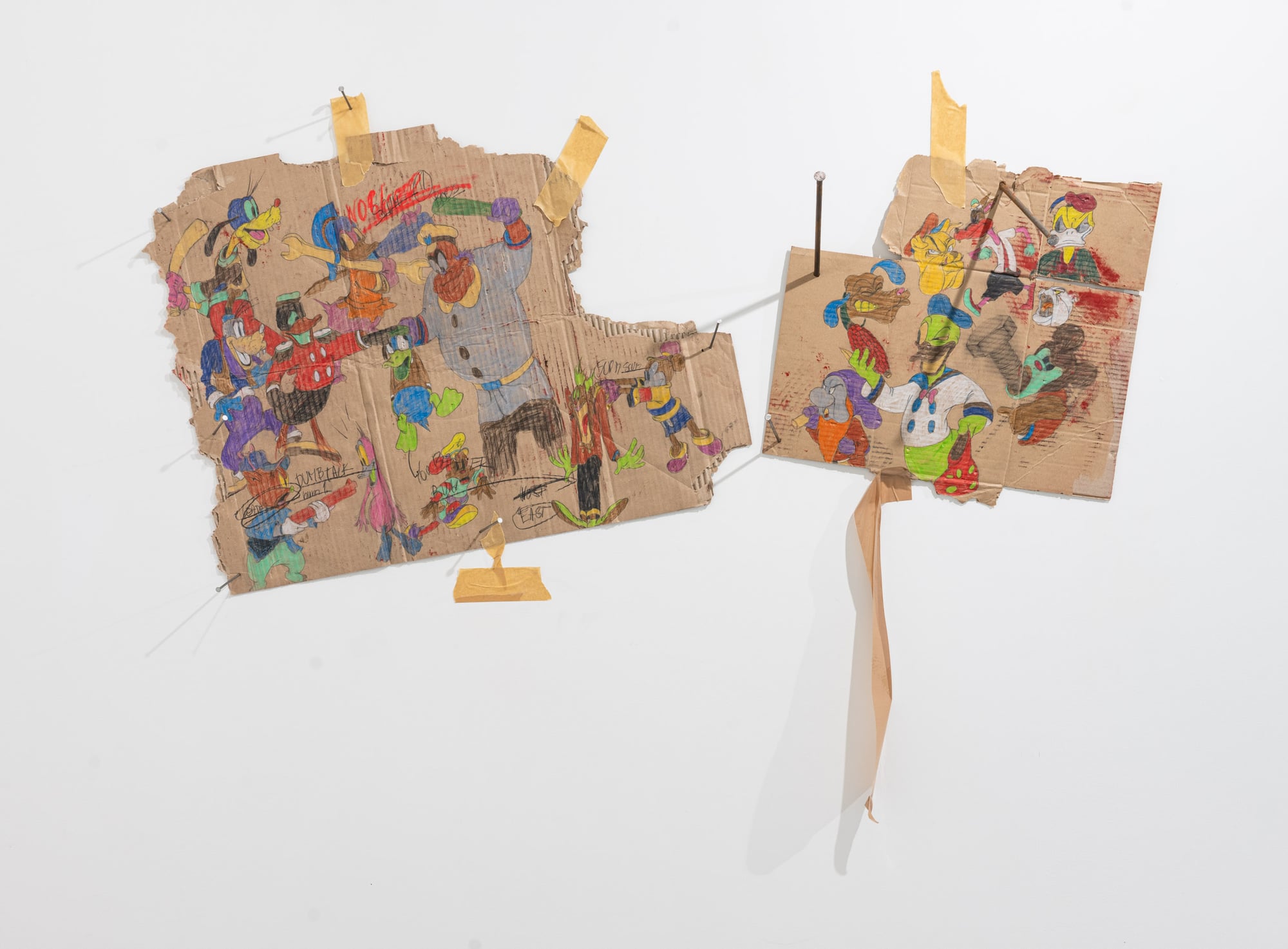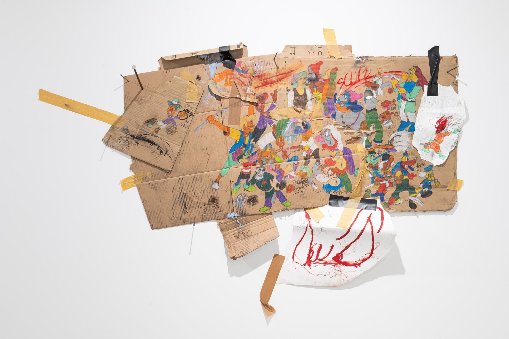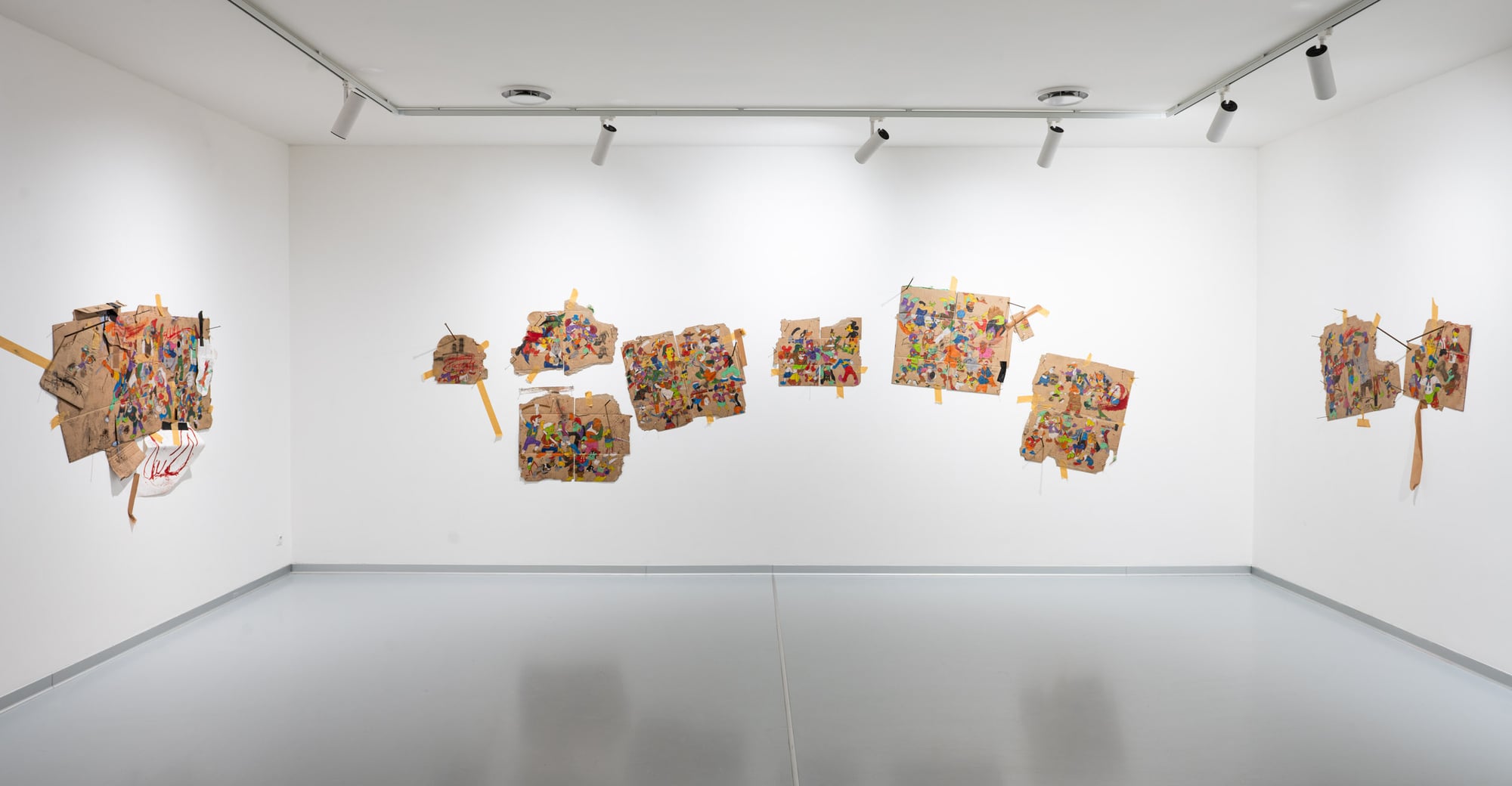 Reject is an exhibition in which Ester Parasková abandons serial painting in favor of an expanded drawing installation. The works are executed on fragments of cardboard—flattened boxes and packaging remnants—assembled into wall-based compositions held together with packing tape. This raw, disposable material becomes a crucial carrier of meaning: its anonymity and industrial origin contrast sharply with the precision of drawing and the intensity of applied pigments. The exhibition draws on themes of labor, monotony, and mass production, transforming processes typically associated with banality and repetition into sites of emotional charge and tension. Appropriated animated figures, previously present only as fragments, now appear as stylized types or acting characters. Rather than passive references, they operate as agents within unstable, chaotic scenes marked by conflict and pressure. Reject frames the notion of the defective product as a critical metaphor—an error within an apparently efficient system. The exhibition evokes a latent dystopia, questioning whether disruption or change is possible from within structures that shape and reproduce us. Through material choice, fragmentation, and gesture, Parasková exposes both the fragility of such systems and the potential for their interruption.
