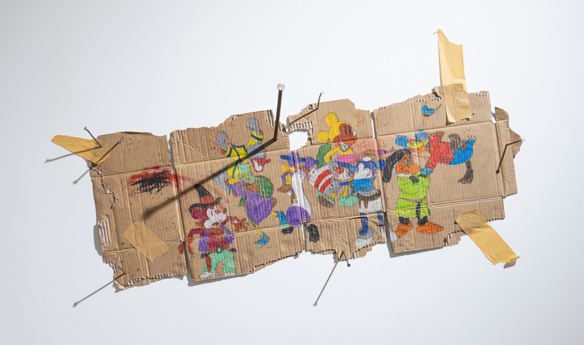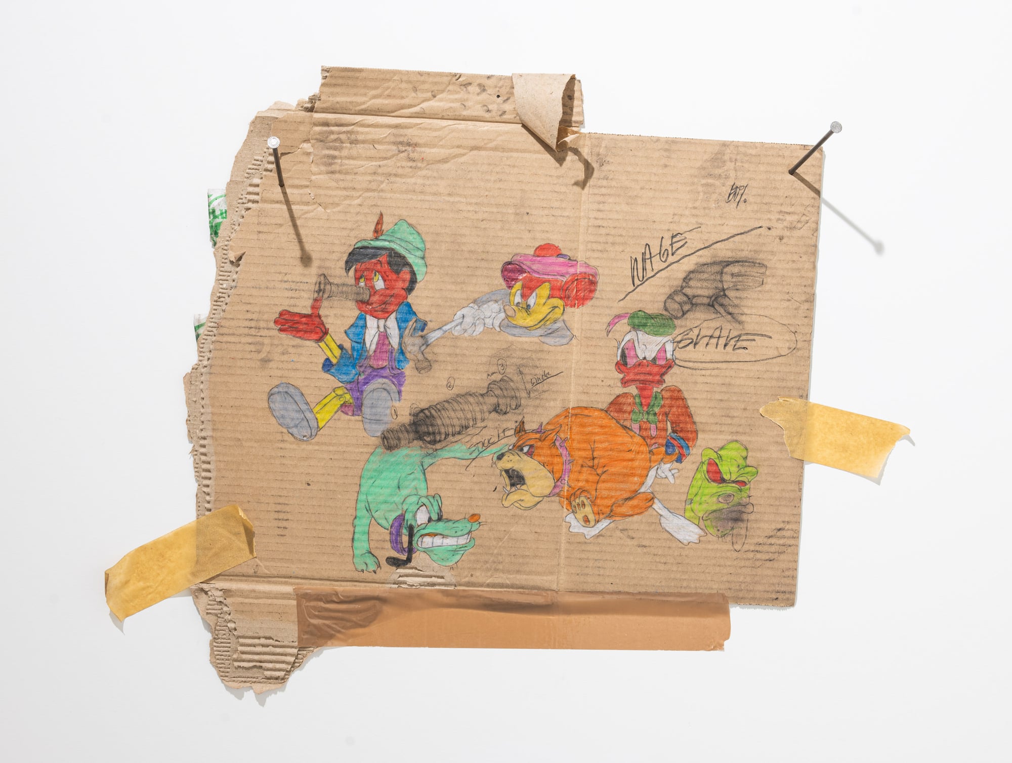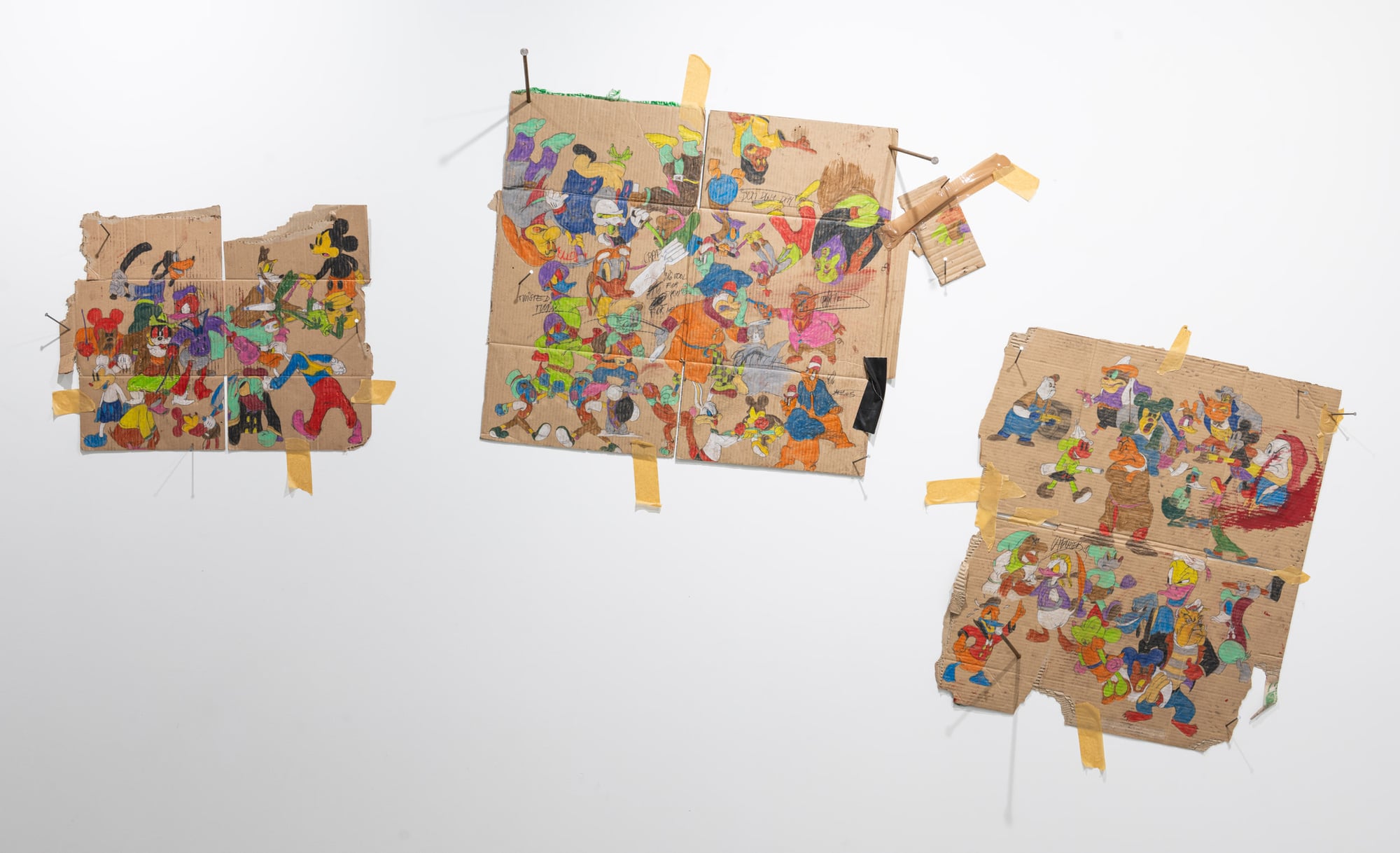 Reject is an exhibition in which Ester Parasková abandons serial painting in favor of an expanded drawing installation. The works are executed on fragments of cardboard—flattened boxes and packaging remnants—assembled into wall-based compositions held together with packing tape. This raw, disposable material becomes a crucial carrier of meaning: its anonymity and industrial origin contrast sharply with the precision of drawing and the intensity of applied pigments. The exhibition draws on themes of labor, monotony, and mass production, transforming processes typically associated with banality and repetition into sites of emotional charge and tension. Appropriated animated figures, previously present only as fragments, now appear as stylized types or acting characters. Rather than passive references, they operate as agents within unstable, chaotic scenes marked by conflict and pressure. Reject frames the notion of the defective product as a critical metaphor—an error within an apparently efficient system. The exhibition evokes a latent dystopia, questioning whether disruption or change is possible from within structures that shape and reproduce us. Through material choice, fragmentation, and gesture, Parasková exposes both the fragility of such systems and the potential for their interruption.
