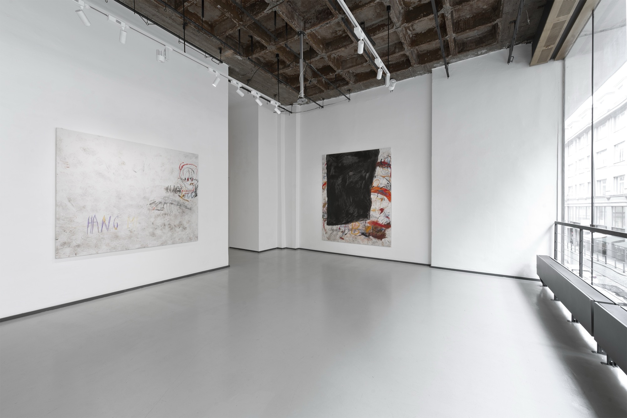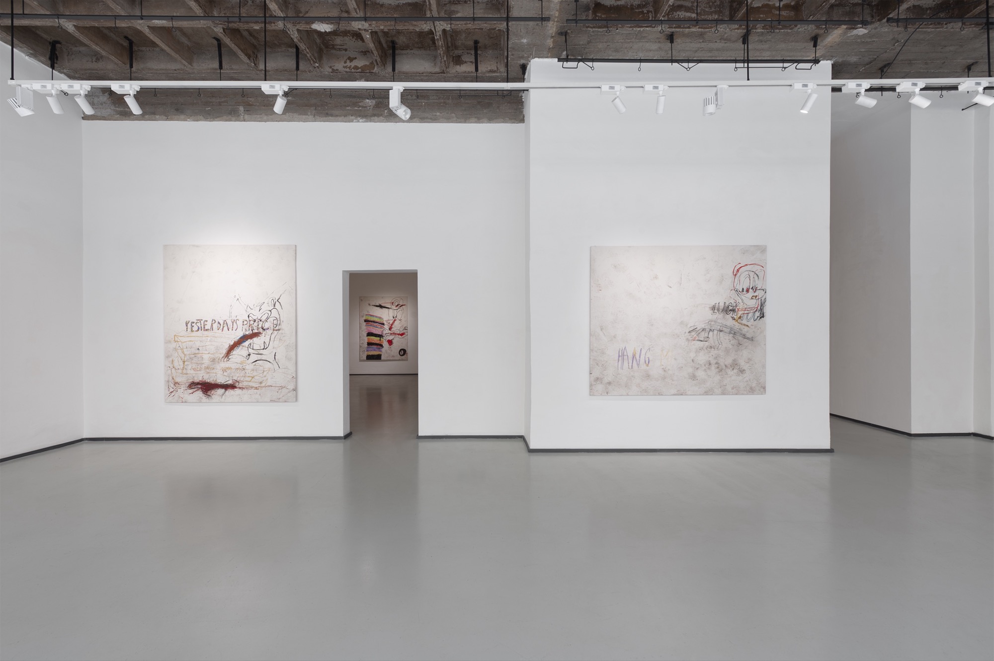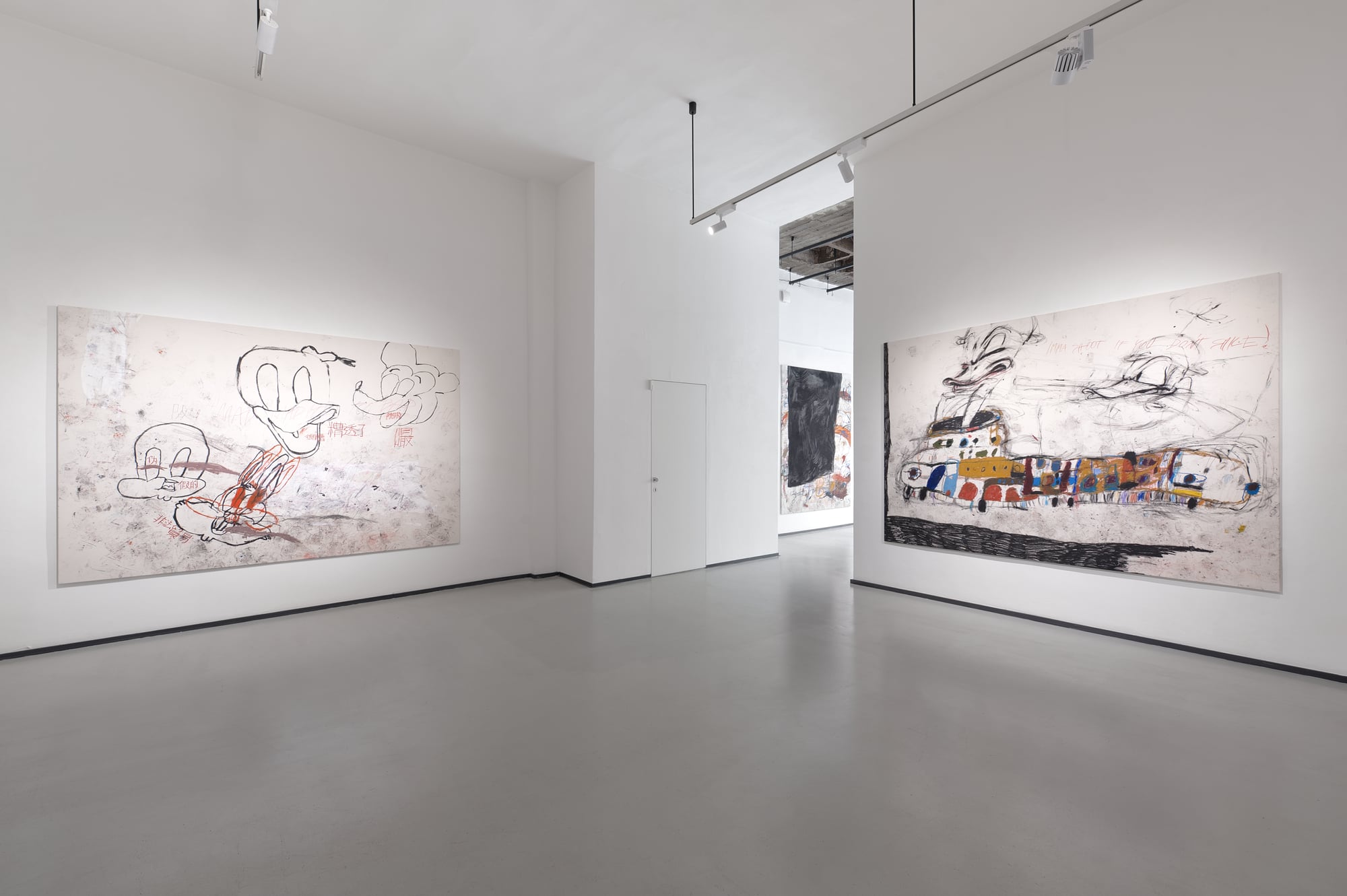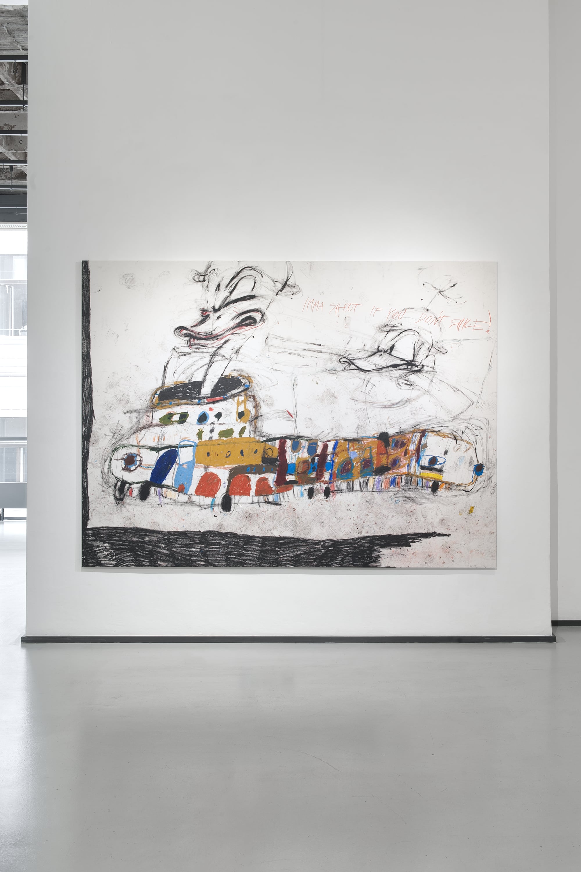 SUCK is an exhibition produced under conditions of bodily interruption. During its preparation, Parasková repeatedly moved between the studio and home to breastfeed her three-month-old child, structuring the work through cycles of extraction, return, and resumed production. The title SUCK names both a physical act and a systemic condition: the continuous drawing of energy, time, and attention from the body. Large-scale paintings occupy the expansive exhibition space, amplifying exhaustion rather than spectacle. Fragmented and disassembled Disney figures appear as unstable bodies, stripped of narrative coherence and reinserted into new social and productive systems. These figures carry human traits and gestures, staging recurring conflicts embedded in contemporary structures of labor, care, and survival. By collapsing domestic and artistic time into a single production loop, SUCK exposes exhaustion not as a private experience, but as a structural reality.