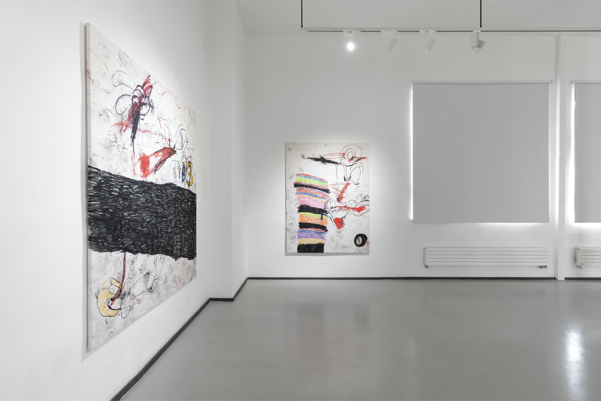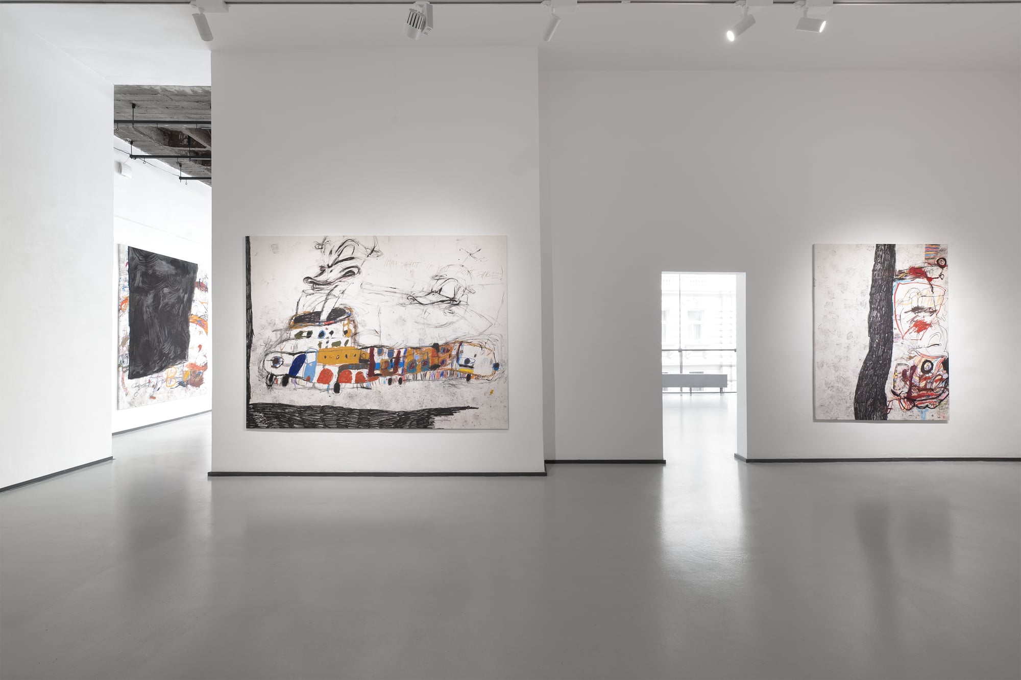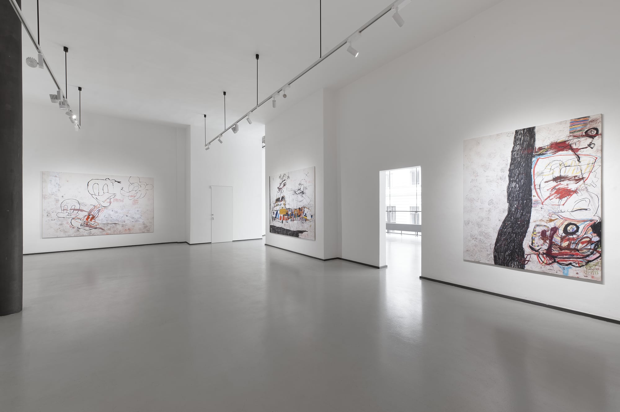 SUCK is an exhibition produced under conditions of bodily interruption. During its preparation, Parasková repeatedly moved between the studio and home to breastfeed her three-month-old child, structuring the work through cycles of extraction, return, and resumed production. The title SUCK names both a physical act and a systemic condition: the continuous drawing of energy, time, and attention from the body. Large-scale paintings occupy the expansive exhibition space, amplifying exhaustion rather than spectacle. Fragmented and disassembled Disney figures appear as unstable bodies, stripped of narrative coherence and reinserted into new social and productive systems. These figures carry human traits and gestures, staging recurring conflicts embedded in contemporary structures of labor, care, and survival. By collapsing domestic and artistic time into a single production loop, SUCK exposes exhaustion not as a private experience, but as a structural reality.