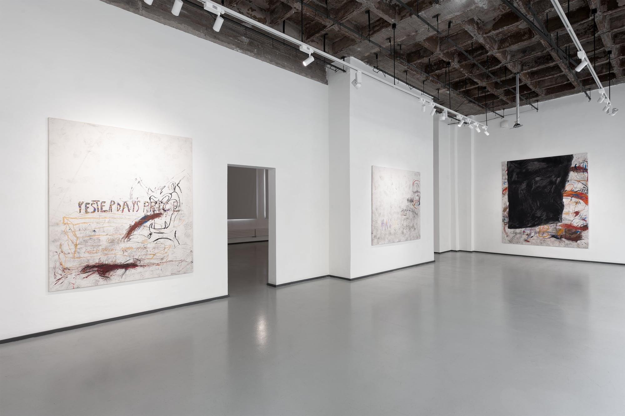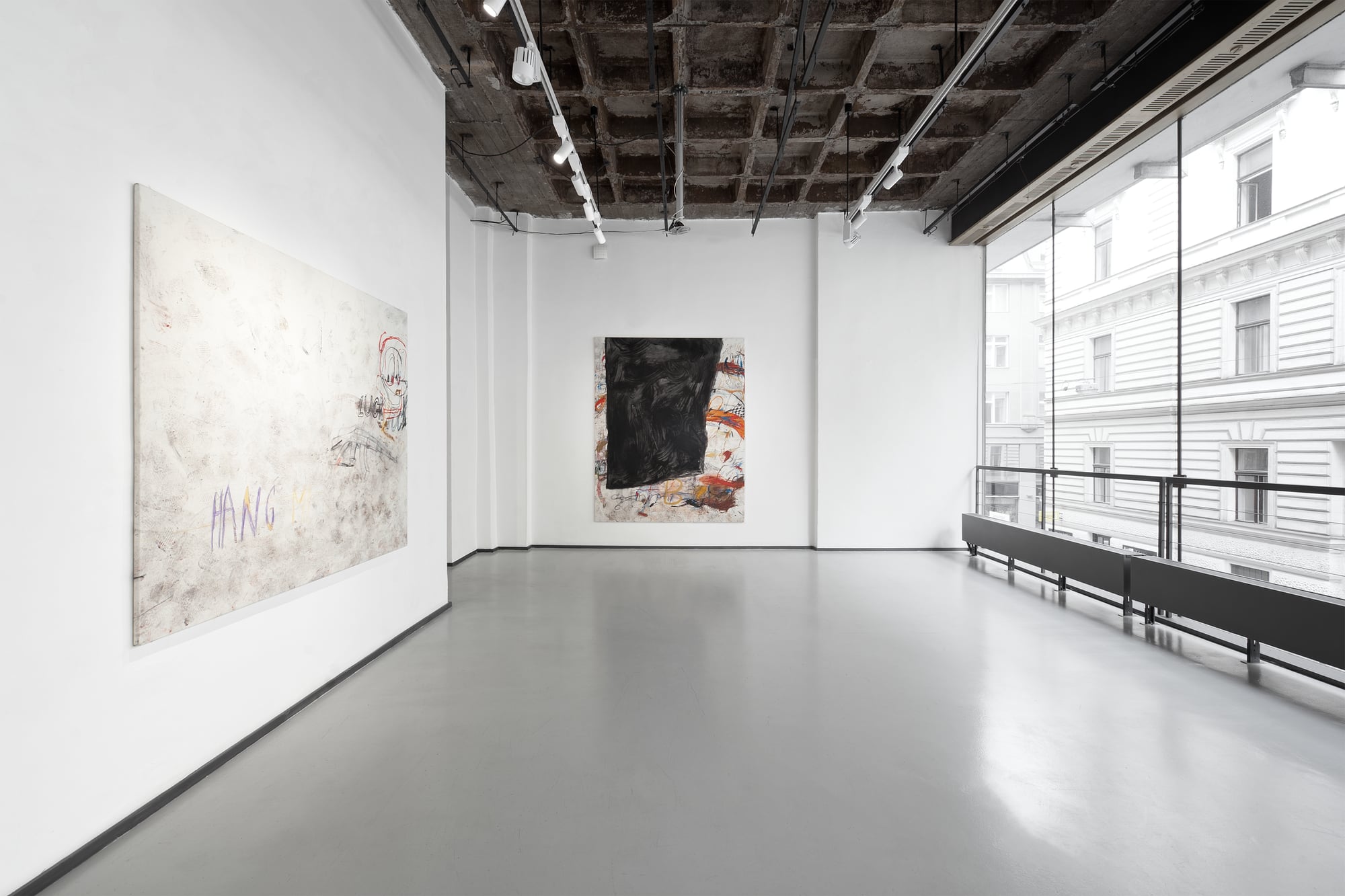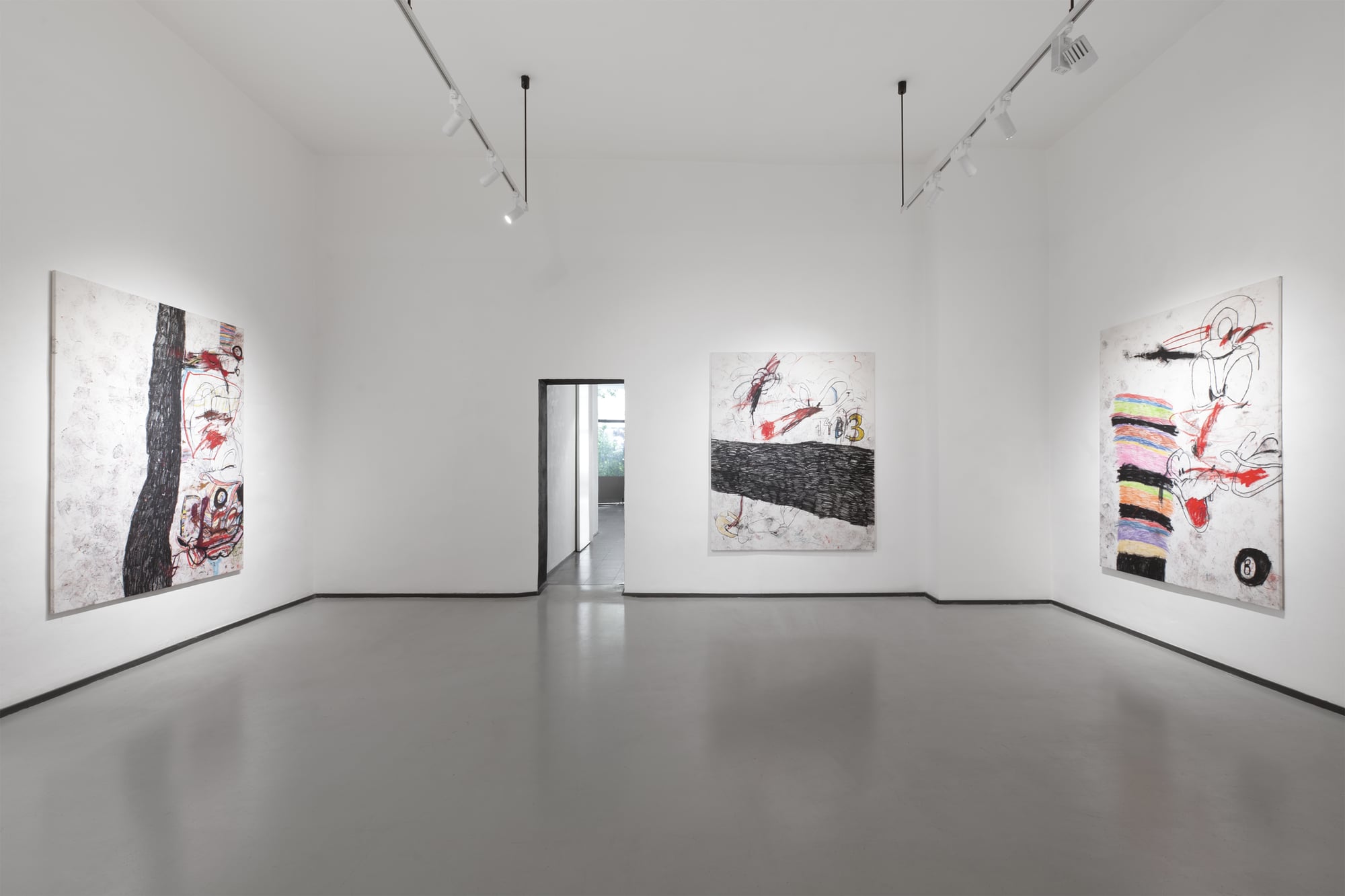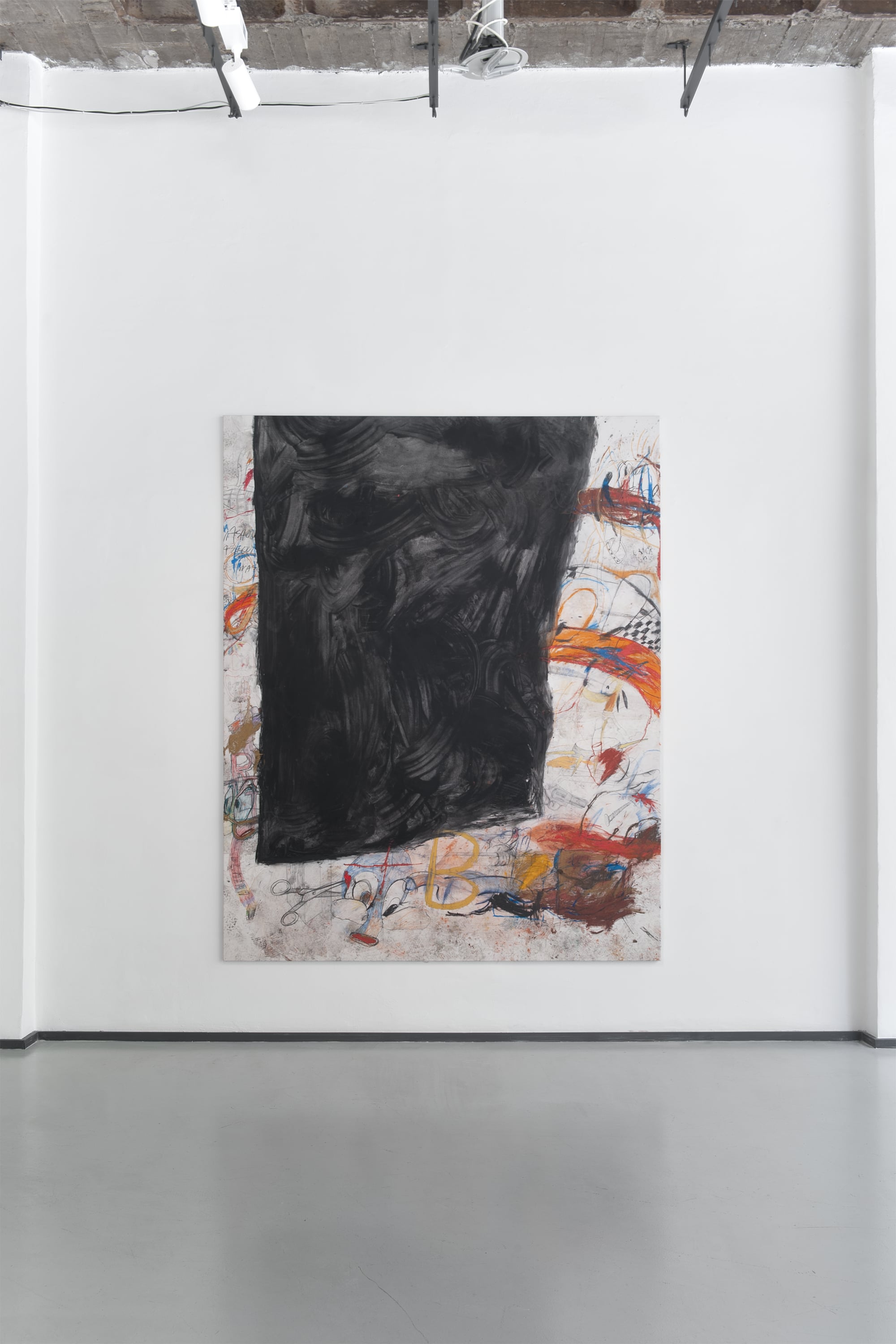 SUCK is an exhibition produced under conditions of bodily interruption. During its preparation, Parasková repeatedly moved between the studio and home to breastfeed her three-month-old child, structuring the work through cycles of extraction, return, and resumed production. The title SUCK names both a physical act and a systemic condition: the continuous drawing of energy, time, and attention from the body. Large-scale paintings occupy the expansive exhibition space, amplifying exhaustion rather than spectacle. Fragmented and disassembled Disney figures appear as unstable bodies, stripped of narrative coherence and reinserted into new social and productive systems. These figures carry human traits and gestures, staging recurring conflicts embedded in contemporary structures of labor, care, and survival. By collapsing domestic and artistic time into a single production loop, SUCK exposes exhaustion not as a private experience, but as a structural reality.